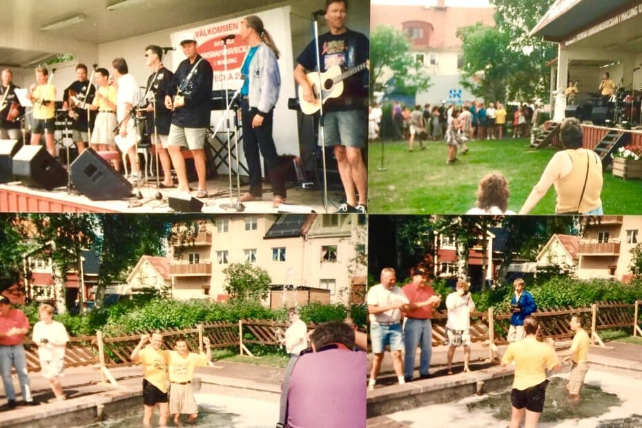 Festivalens marknadsansvarige, Lars Bälter, fick många gånger bada i fontänen, och nu var det också dags att bada för både mig och kollegan Ferm. Någon stack också åt oss varsin öl från Toms krögartält, innan vi skulle fotograferas. Det var som sagt andra tider då….